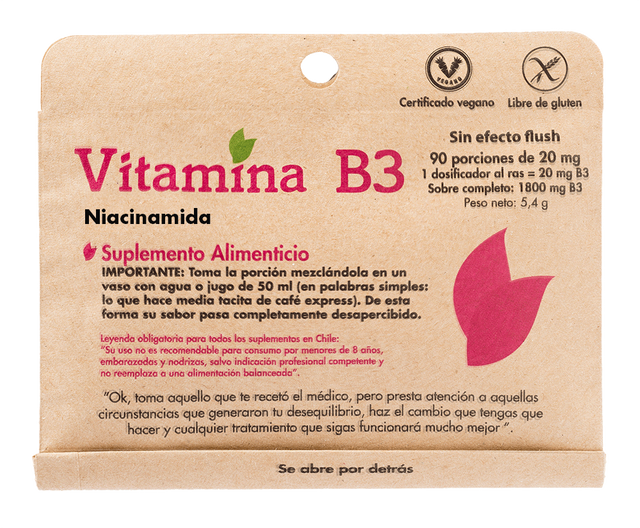 El tipo de B3 de nuestro suplemento es Niacinamida o también llamada Nicotinamida, es aquella que no tiene el indeseado efecto flush de la B3 como ácido nicotínico.