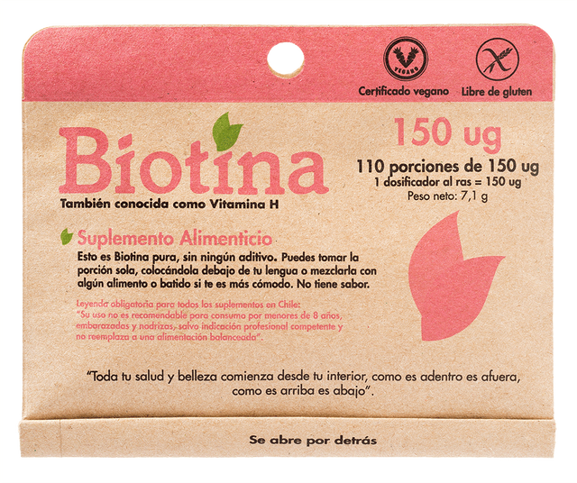 Contiene: 110 porciones con 150 ug de Biotina. Incluye una mini cucharita dosificadora