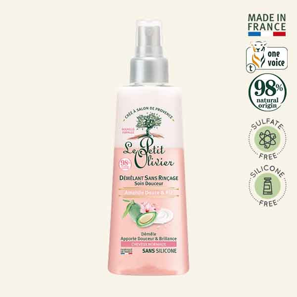 El Desenredante sin enjuague de Le Petit Olivier permite nutrir, reparar y desenredar el cabello seco y dañado. Es un desenredante bifásico, con una parte superior emulsionada y una parte acuosa transparente. Contiene extractos de aceite de oliva, manteca de karité y aceite de argán. Su textura no es grasa y la fragancia es delicada. Suave, liso, rizado, rebelde... Sea cual sea la naturaleza de tu cabello, el spray desenredante te permite domarlo y darle el aspecto deseado. Se utiliza después del shampoo sobre el cabello húmedo, o para el peinado diario sobre el cabello seco.