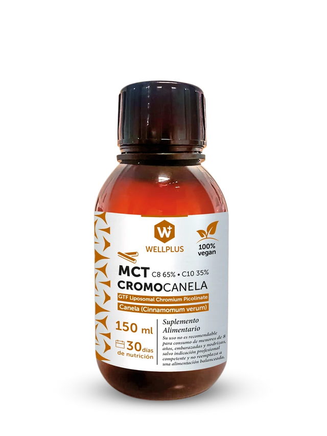 Triglicéridos de Cadena Media MCT en base a Aceite de Coco Orgánico con 65% de MCT-C8 y 35% de MCT-C10 más la potencia de la combinación sinérgica del picolinato de cromo liposomal y la canela que participan en el metabolismo de los azúcares y carbohidratos pudiendo contribuir a niveles de glucosa sanguíneos (glicemia) en rangos saludables.