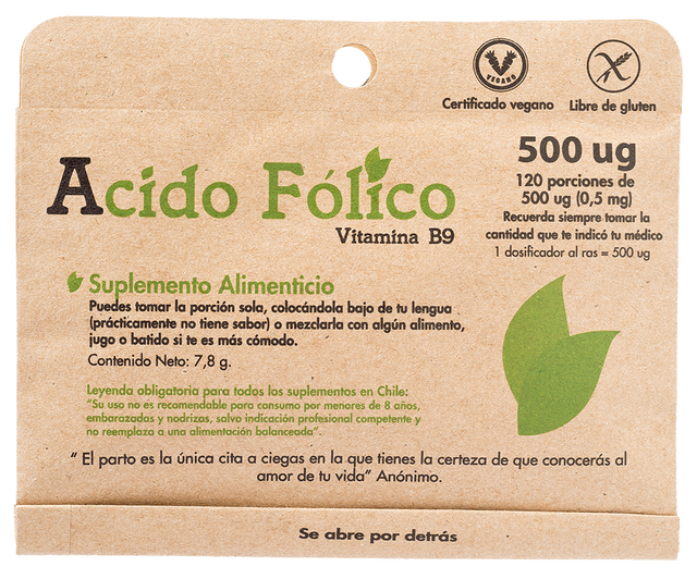 Contiene: 120 porciones de 500 ug (0,5 mg) de ácido fólico