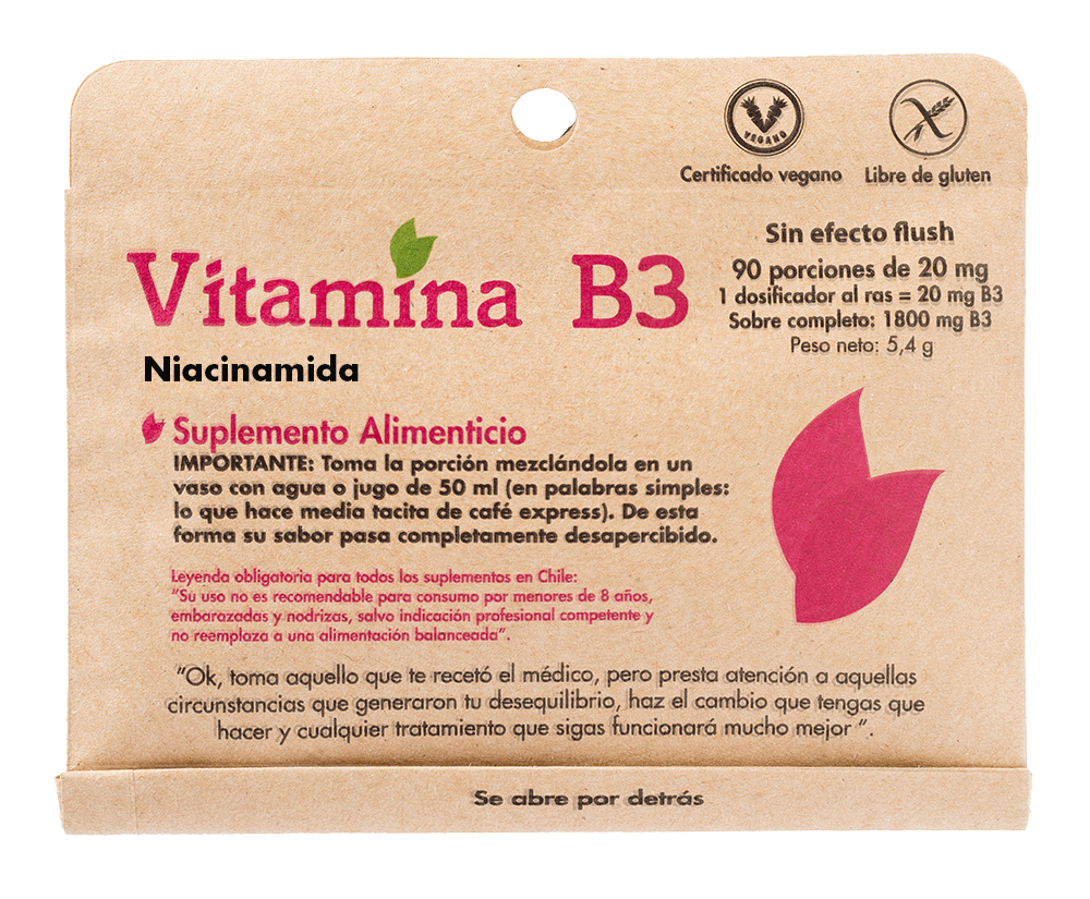 El tipo de B3 de nuestro suplemento es Niacinamida o también llamada Nicotinamida, es aquella que no tiene el indeseado efecto flush de la B3 como ácido nicotínico.