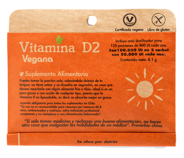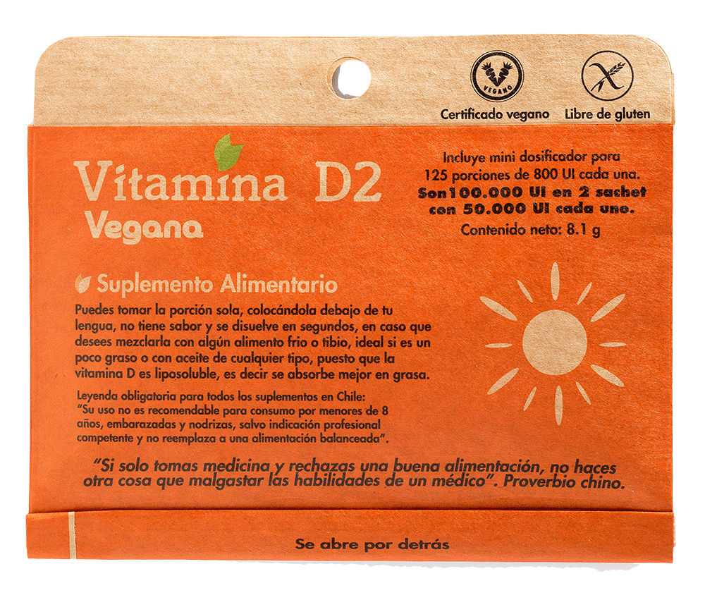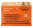 Vitamina D2 (Ergocalciferol): es estrictamente vegana, ya que se produce al irradiar hongos y vegetales. Con la D2, tu cuerpo primero tendrá que transformarla en D3 para luego poder usarla. Ambas vitaminas las mezclamos con un poco de calcio ( 50 mg) de origen mineral que la protege y ayuda a dosificarla.
