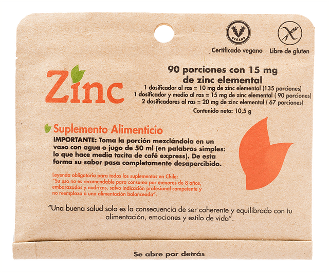 Adultos: A modo de suplemento Toma 1 y media cuacharita dosificadora al ras para obtener 15 mg de zinc elemental.